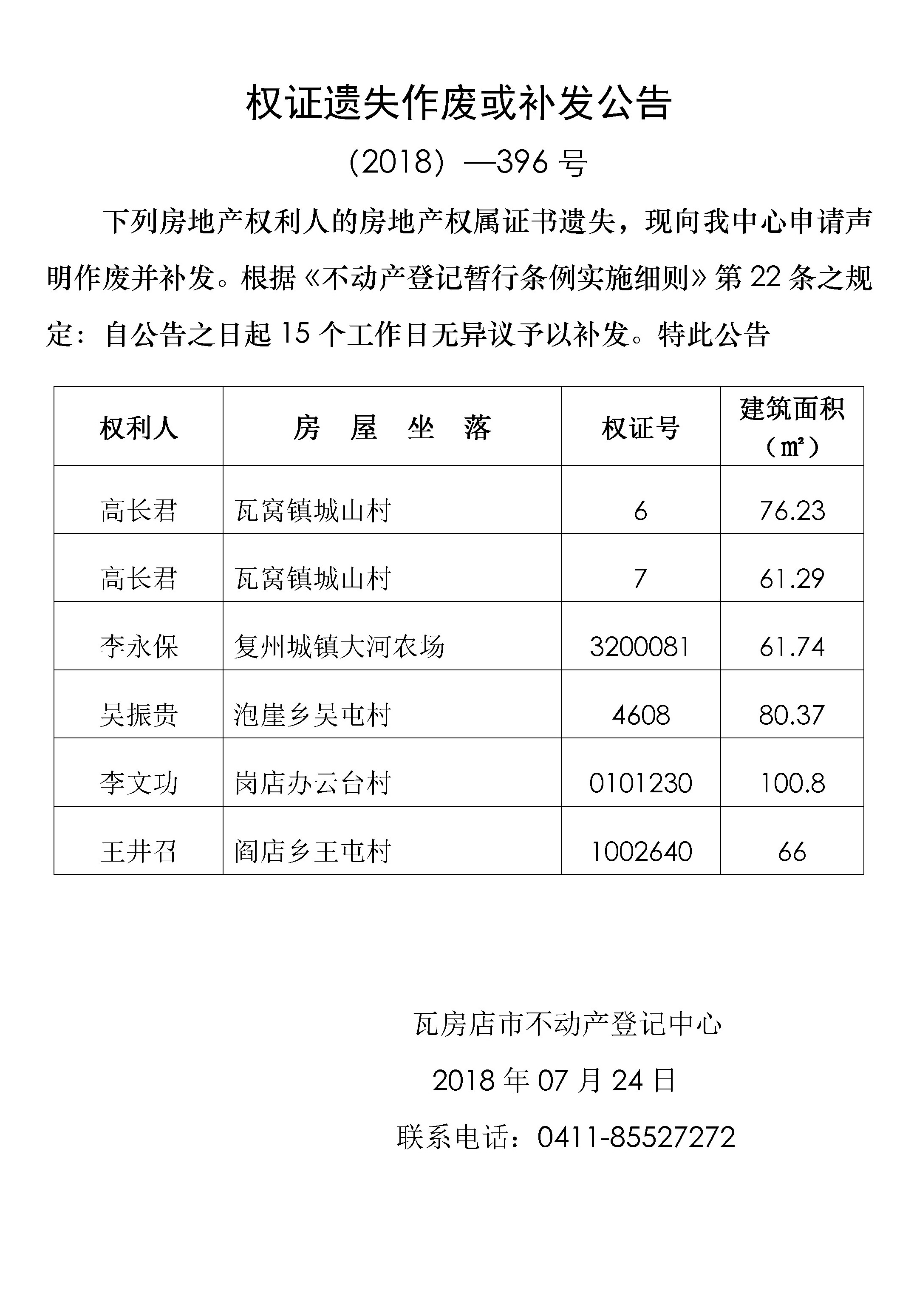 不动产转移登记公告 (2018)-397号