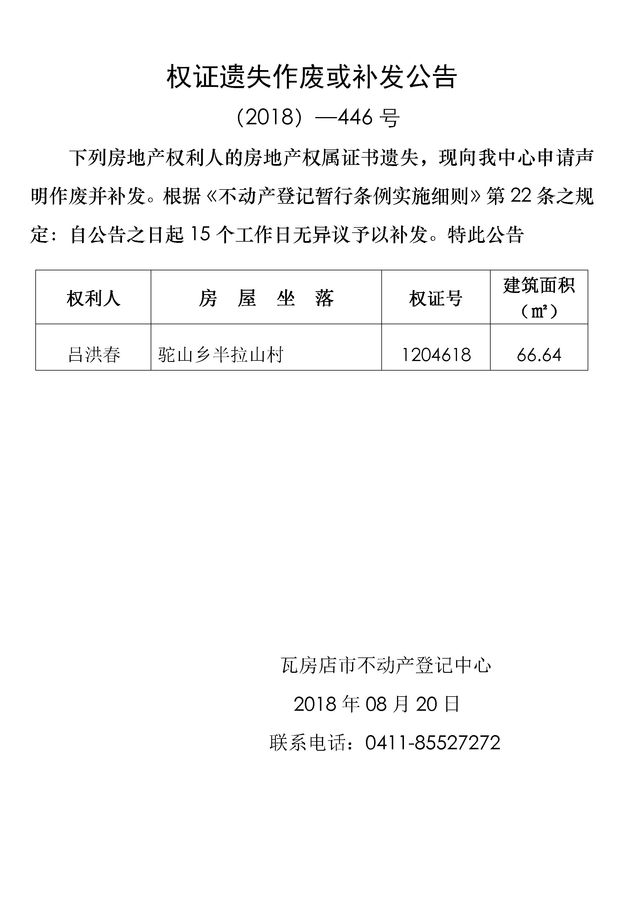 权证遗失公告 (2018)-446号