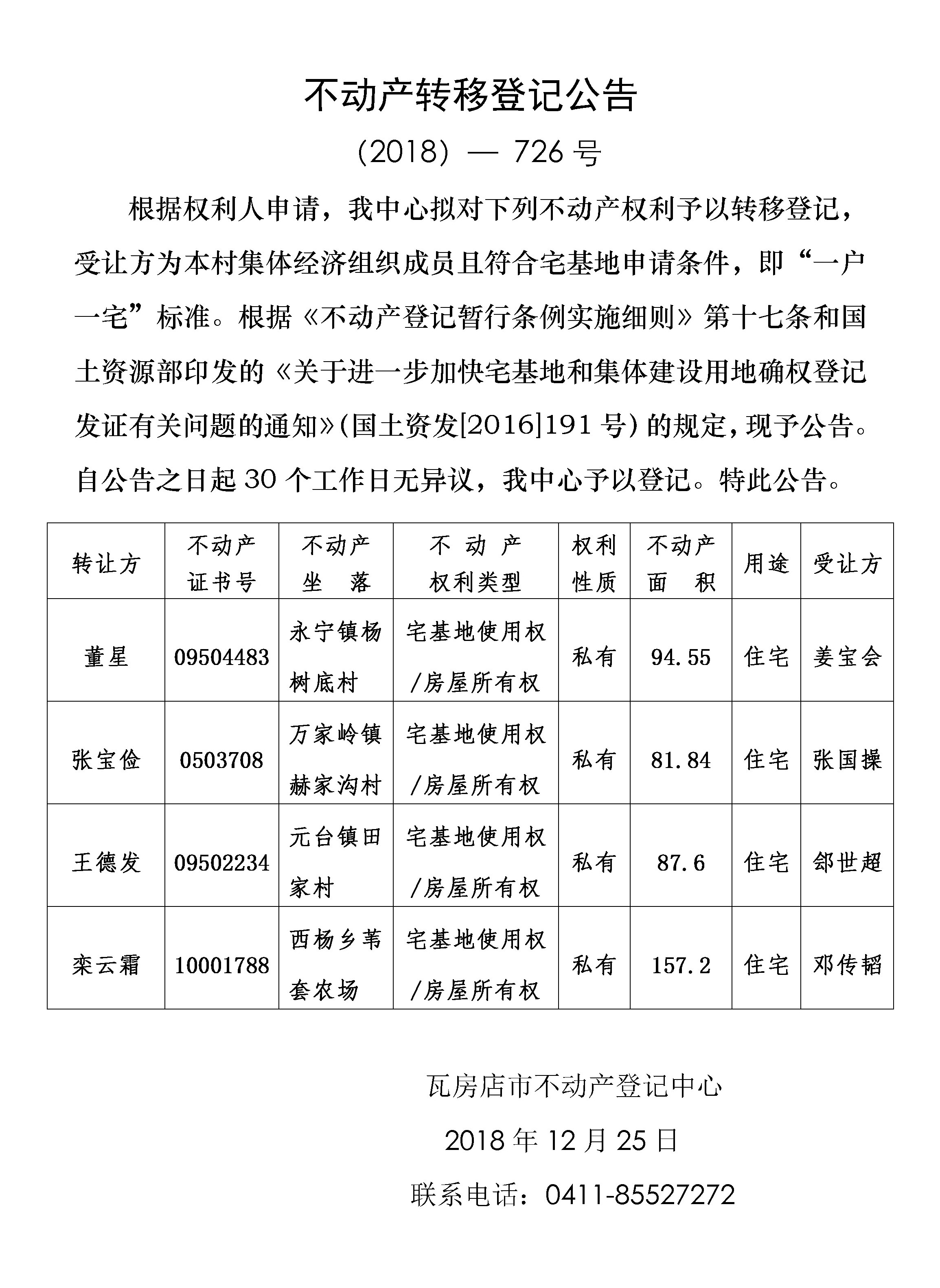 宅基地使用权及房屋所有权首次登记公告 (2018)-727号