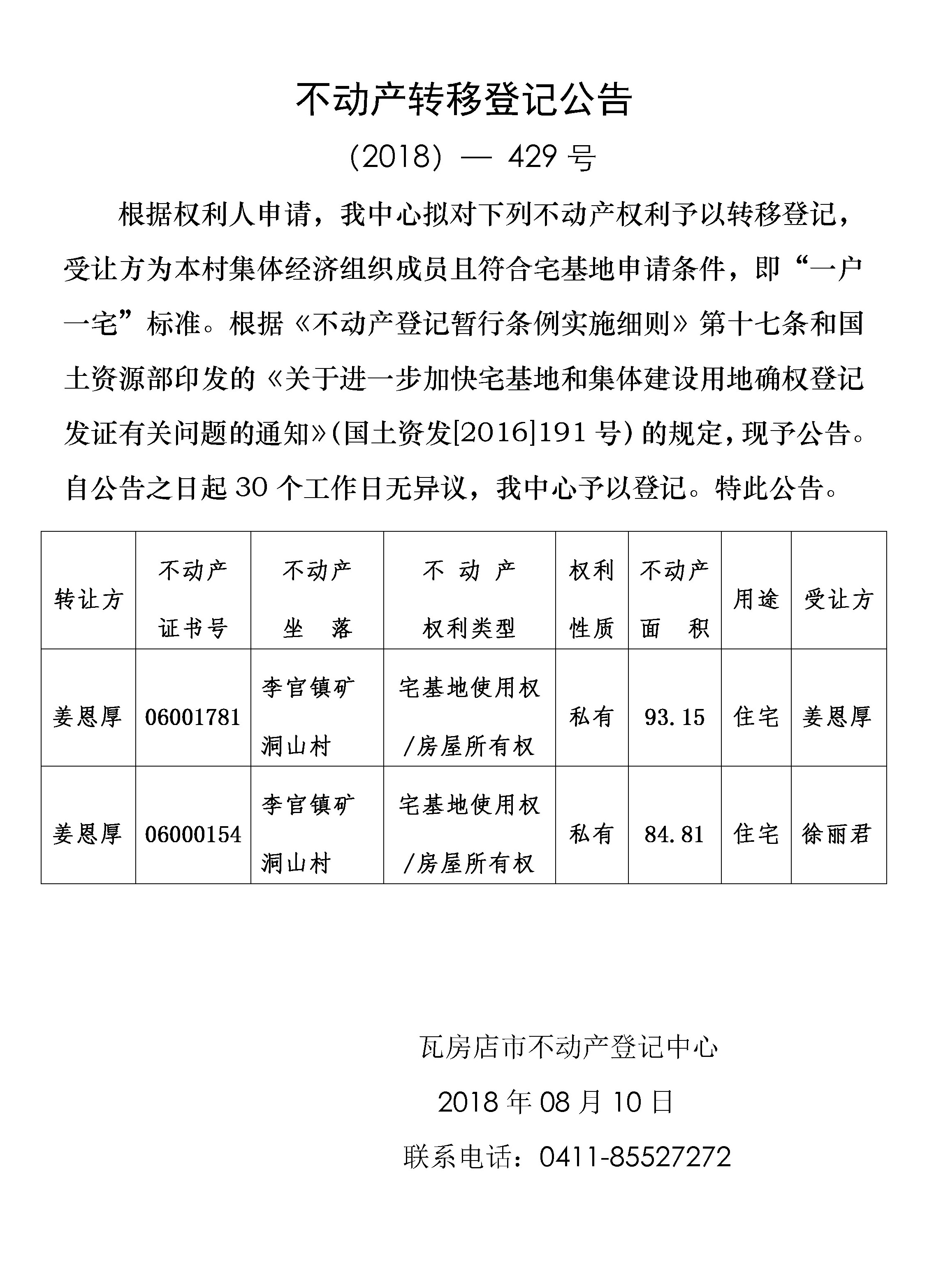 不动产转移登记公告 (2018)-429号