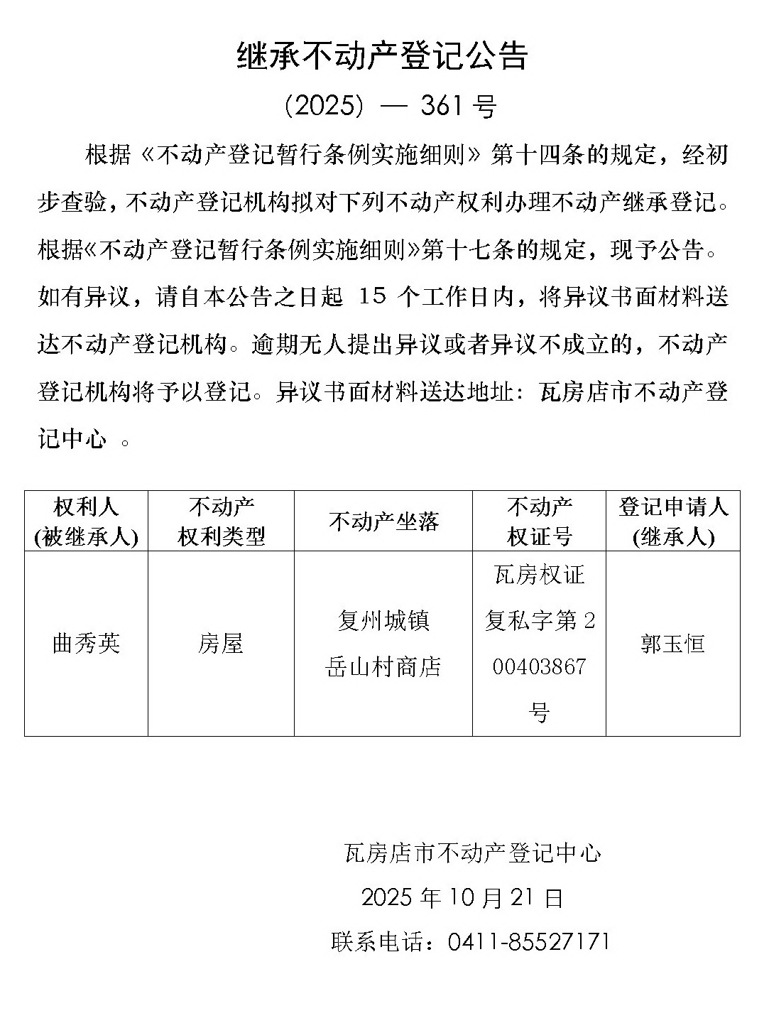 继承不动产登记公告 (2025)-361号