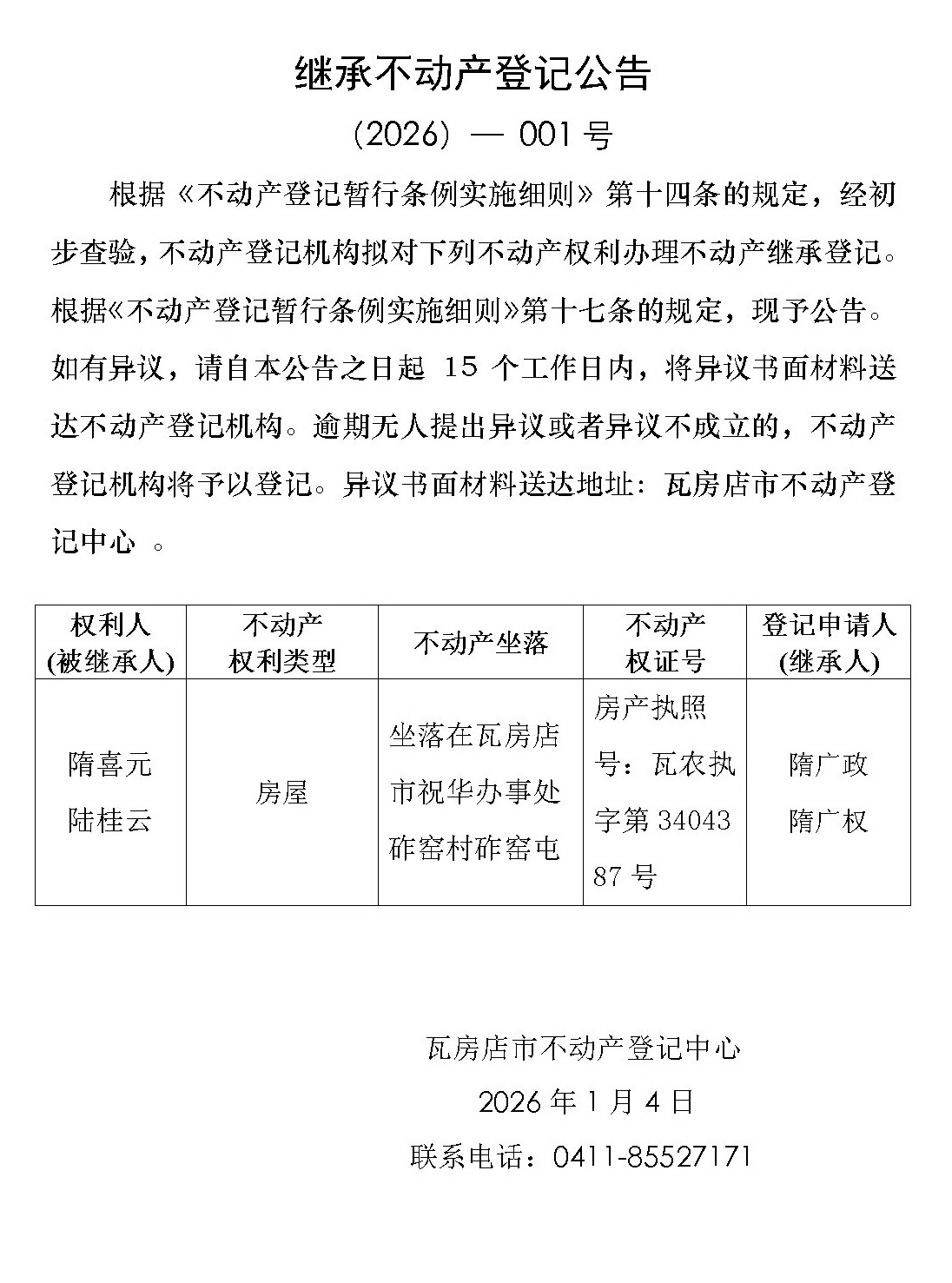 继承不动产登记公告 (2026)-001号