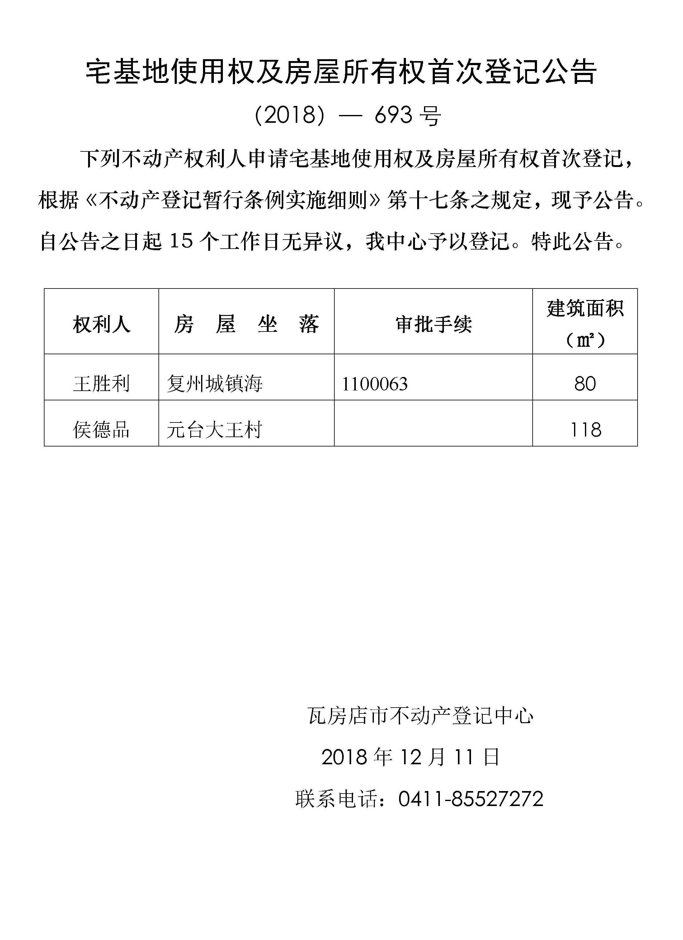 宅基地使用权及房屋所有权首次登记公告 (2018)-693号