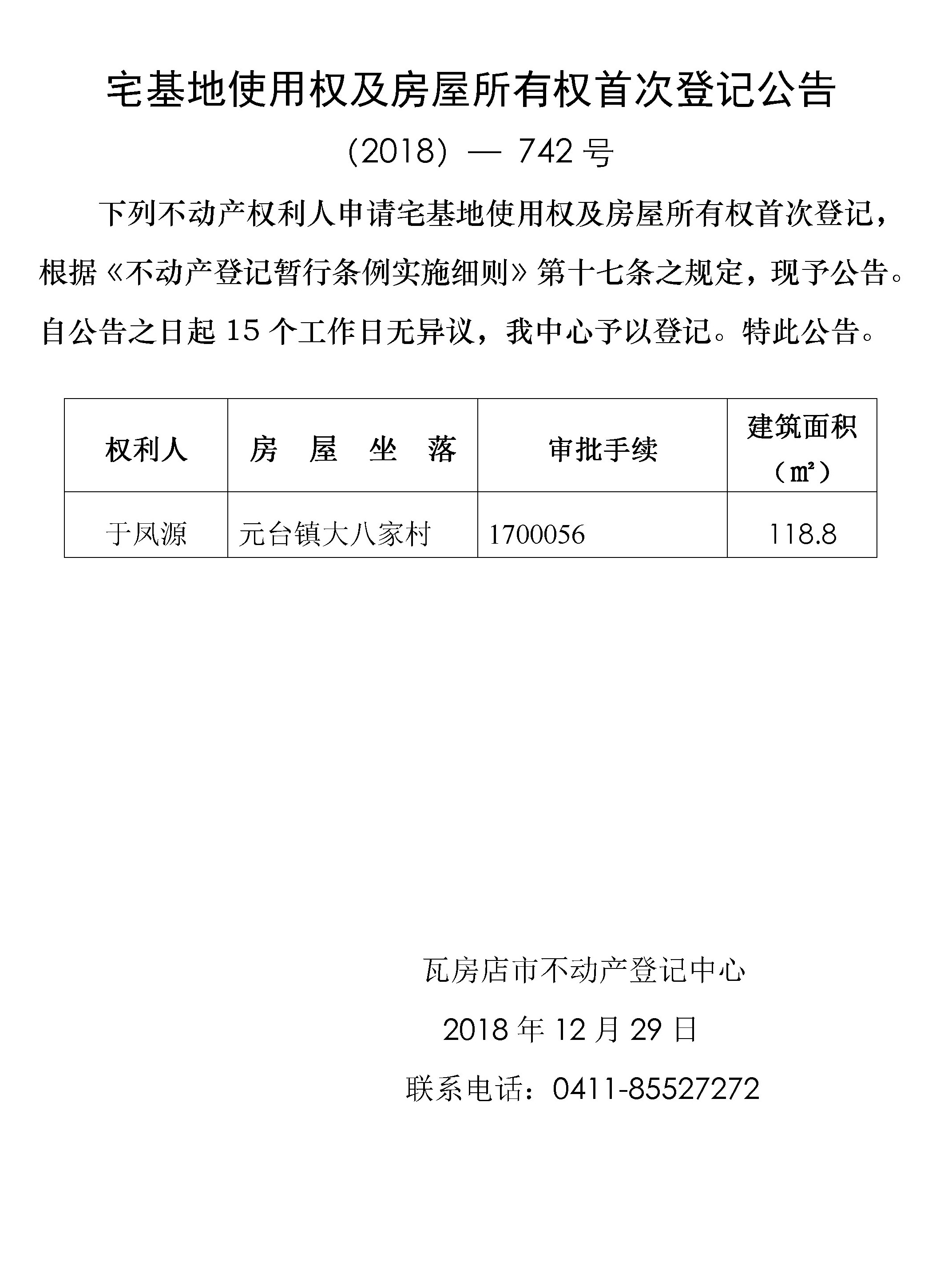 宅基地使用权及房屋所有权首次登记公告 (2018)-742号