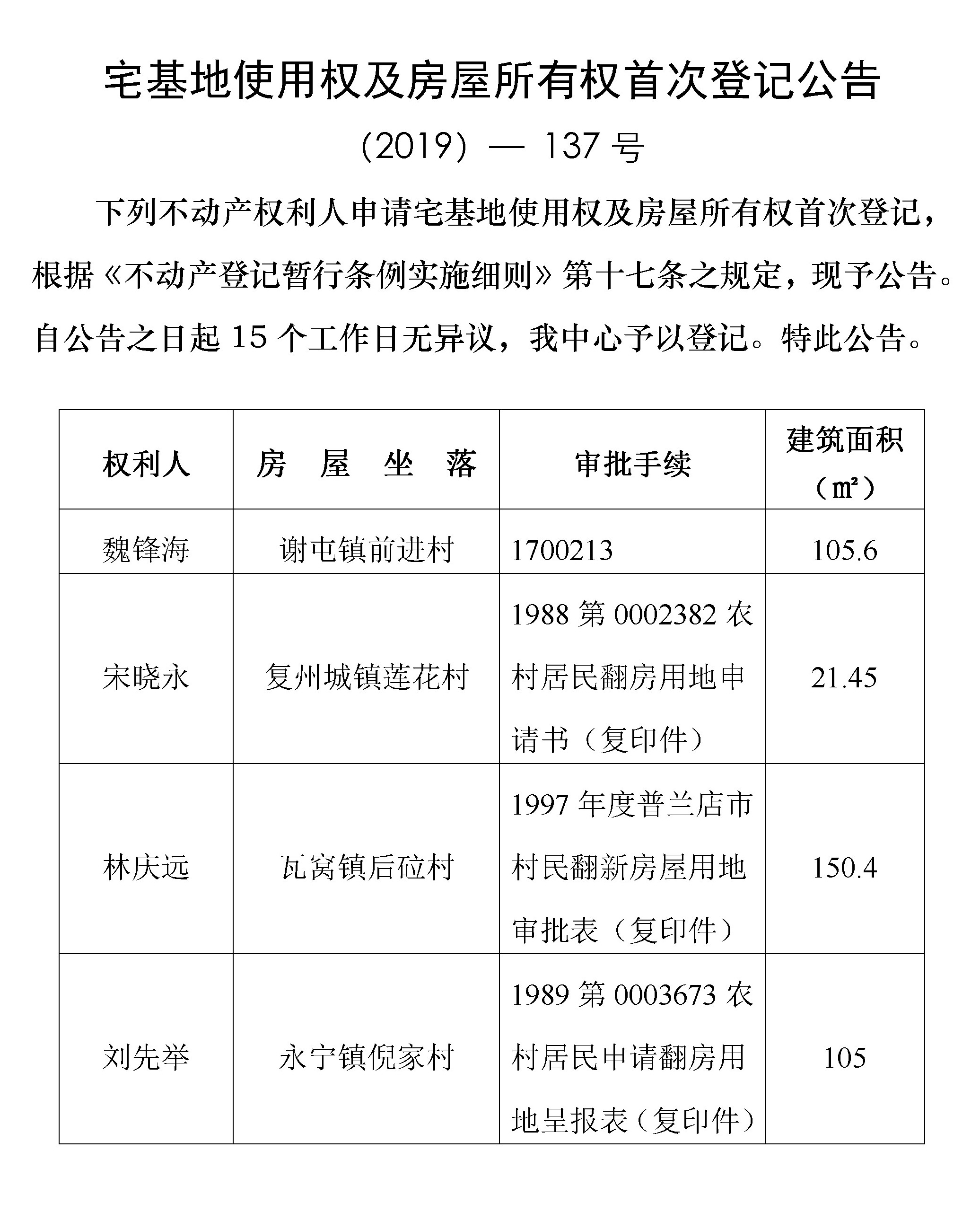 宅基地使用权及房屋所有权首次登记公告 (2019)-137号