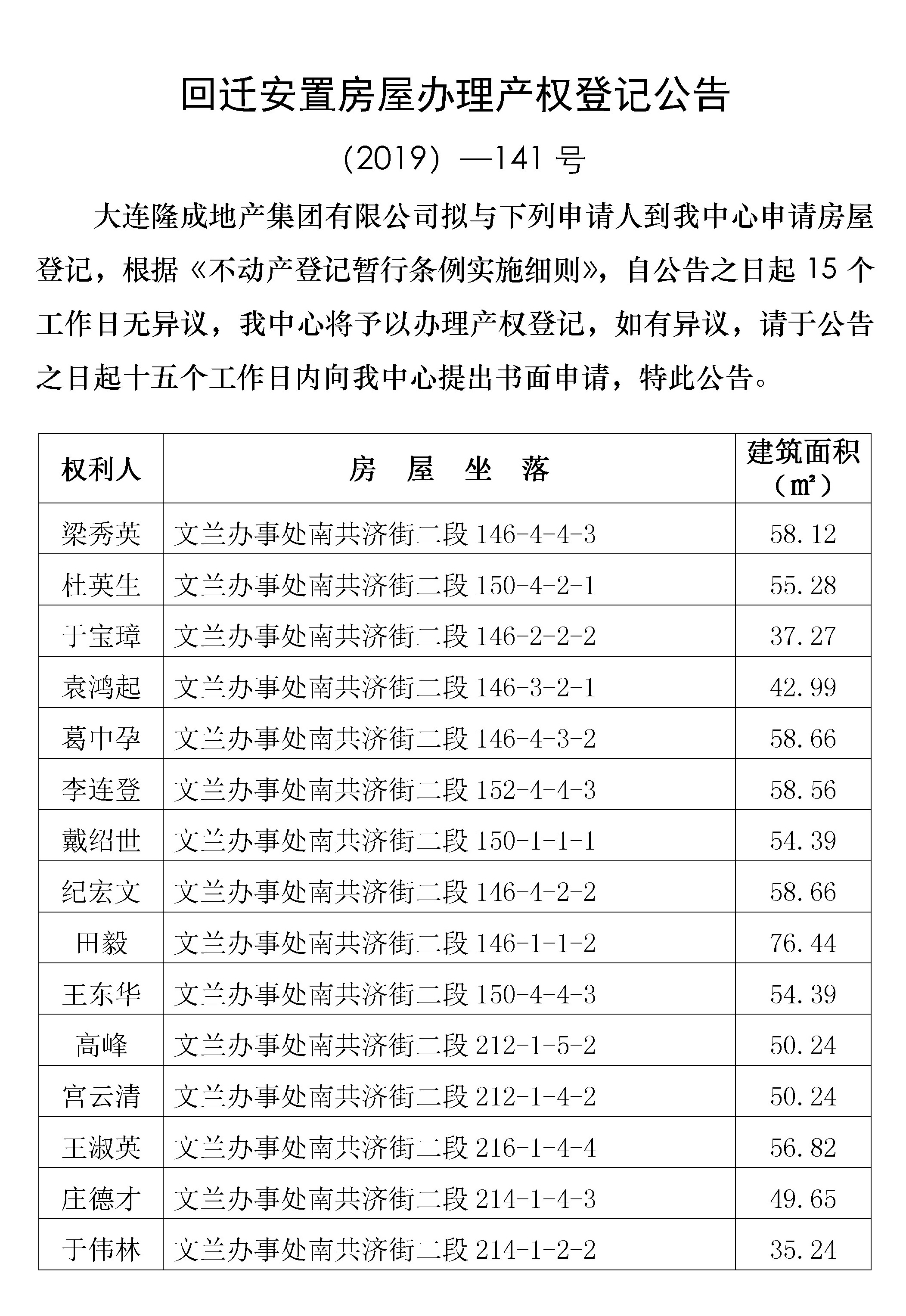 回迁安置房屋办理产权登记公告 (2019)-141号