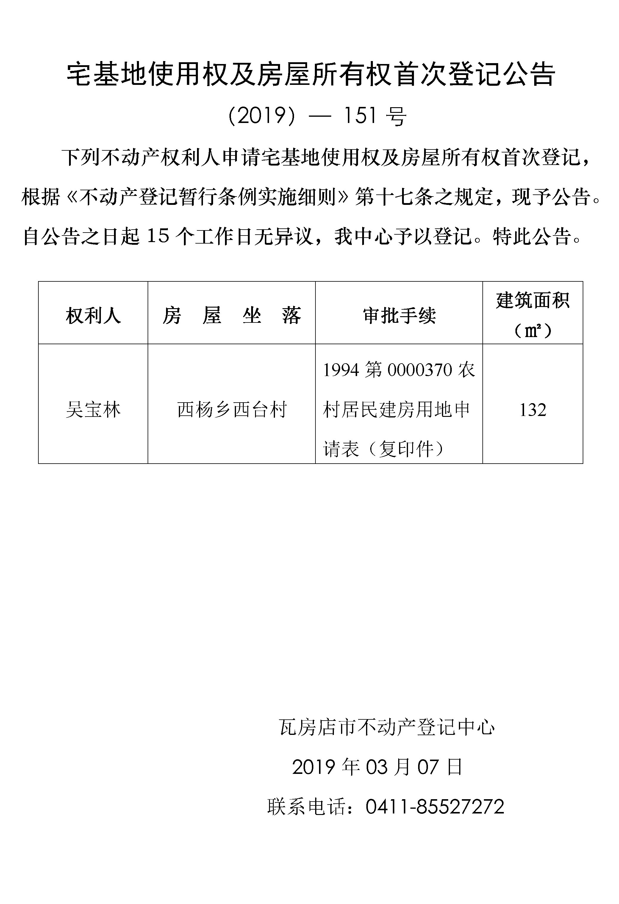 宅基地使用权及房屋所有权首次登记公告 (2019)-151号