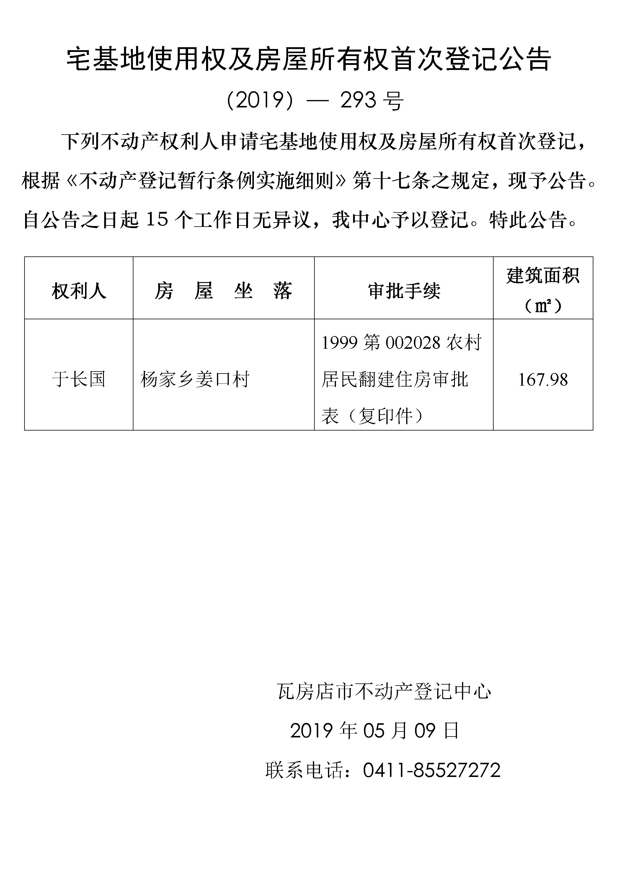 宅基地使用权及房屋所有权首次登记公告 (2019)-293号