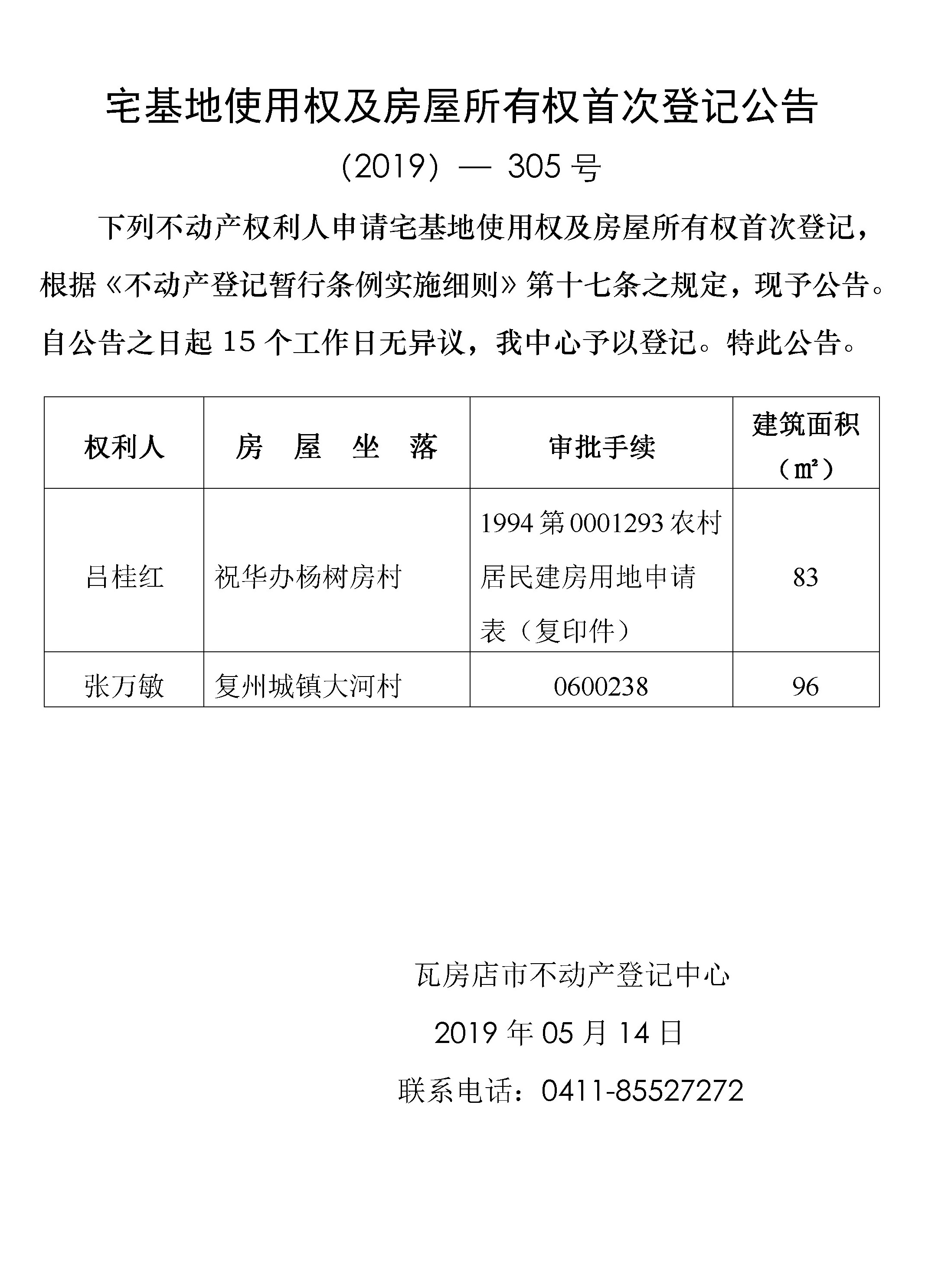 宅基地使用权及房屋所有权首次登记公告 (2019)-305号