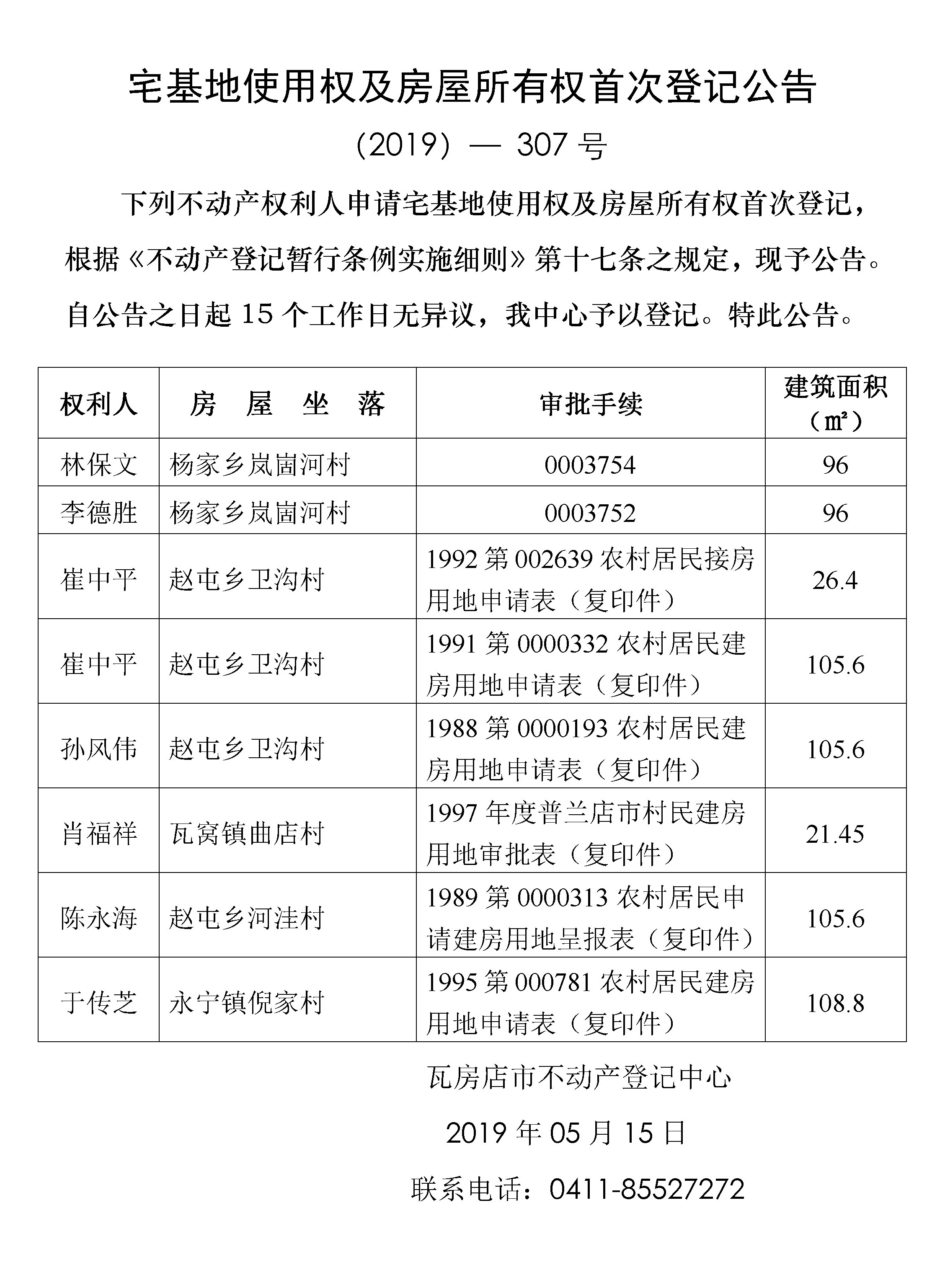 宅基地使用权及房屋所有权首次登记公告 (2019)-307号