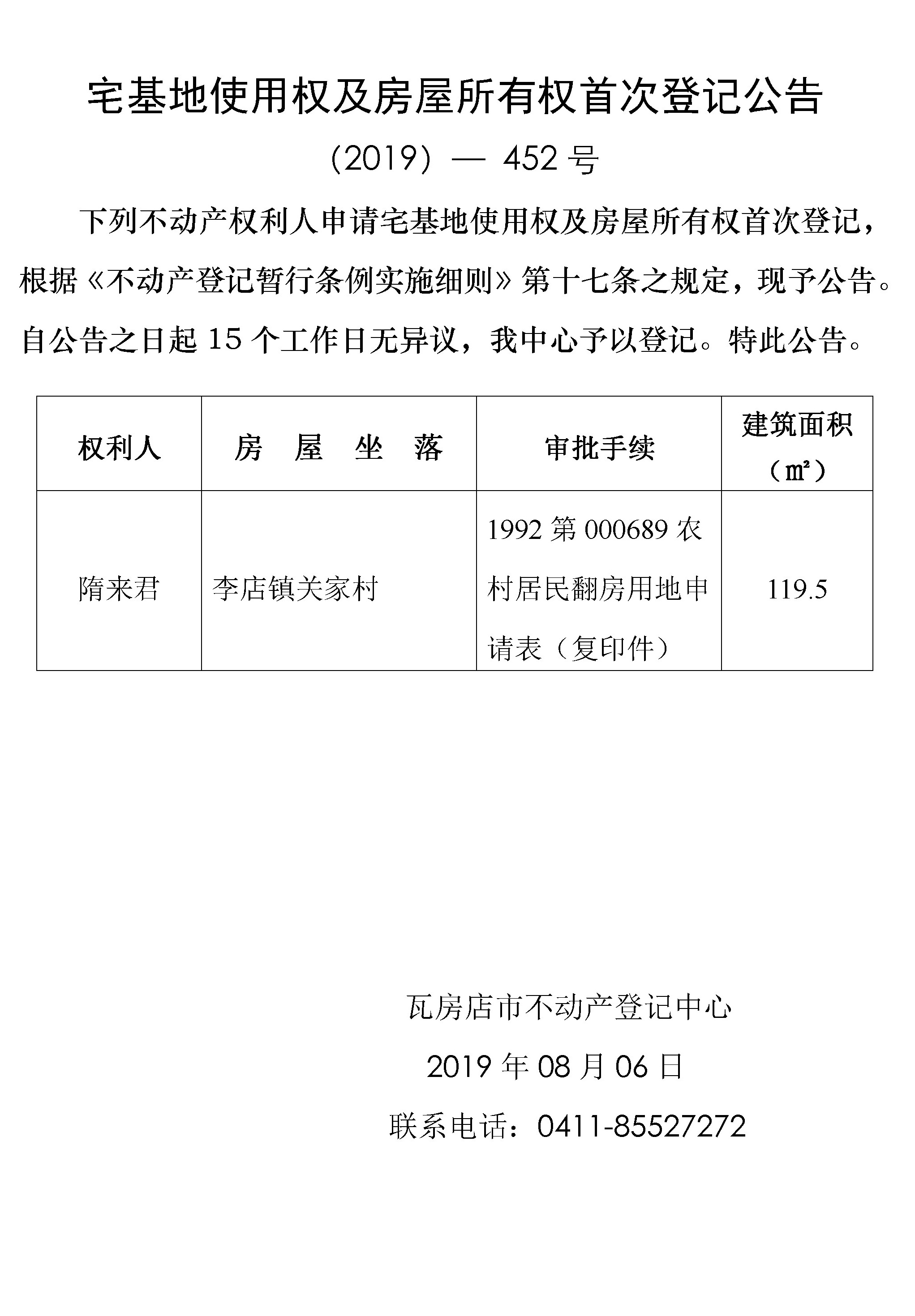 宅基地使用权及房屋所有权首次登记公告 (2019)-452号