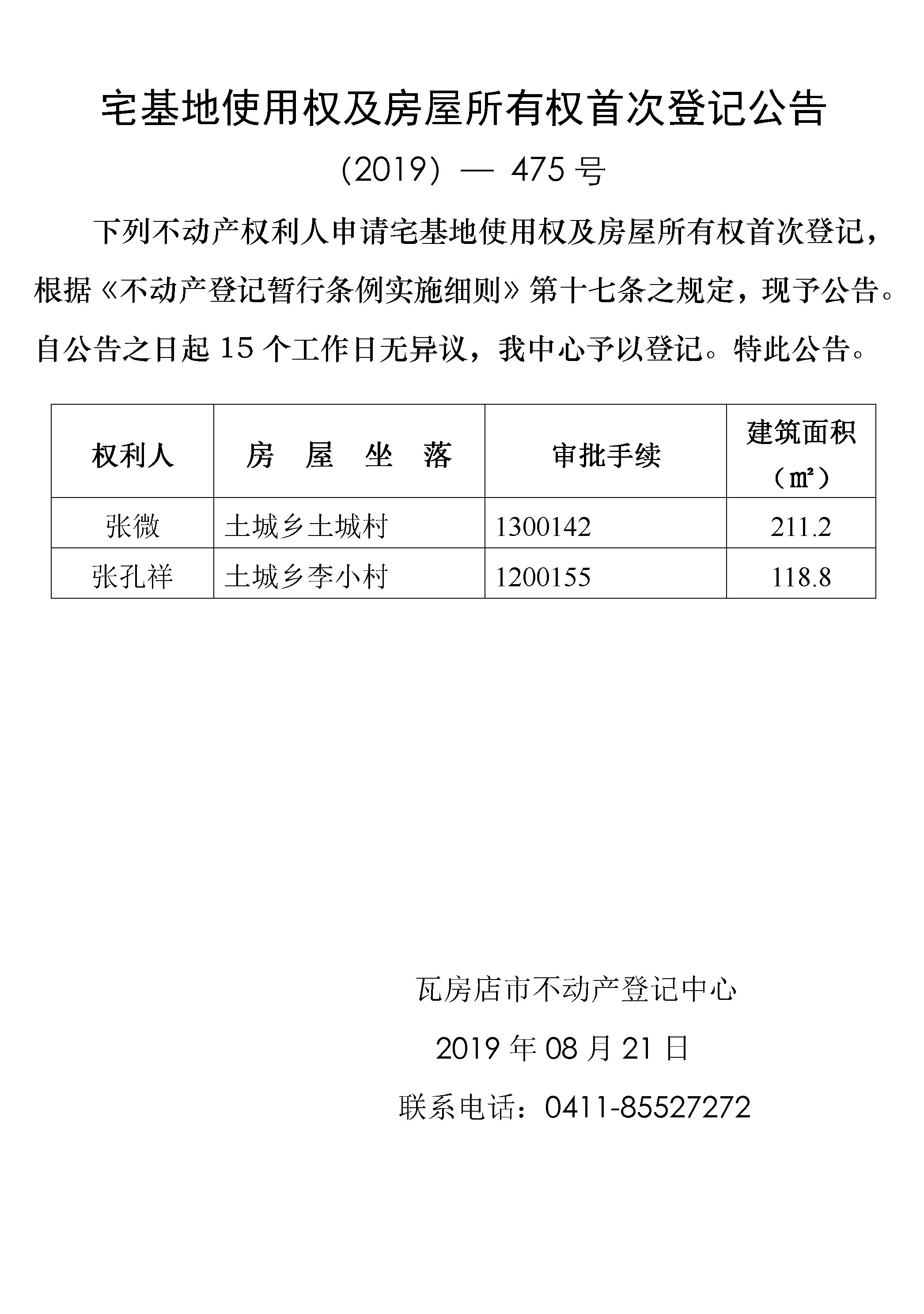 宅基地使用权及房屋所有权首次登记公告 (2019)-475号