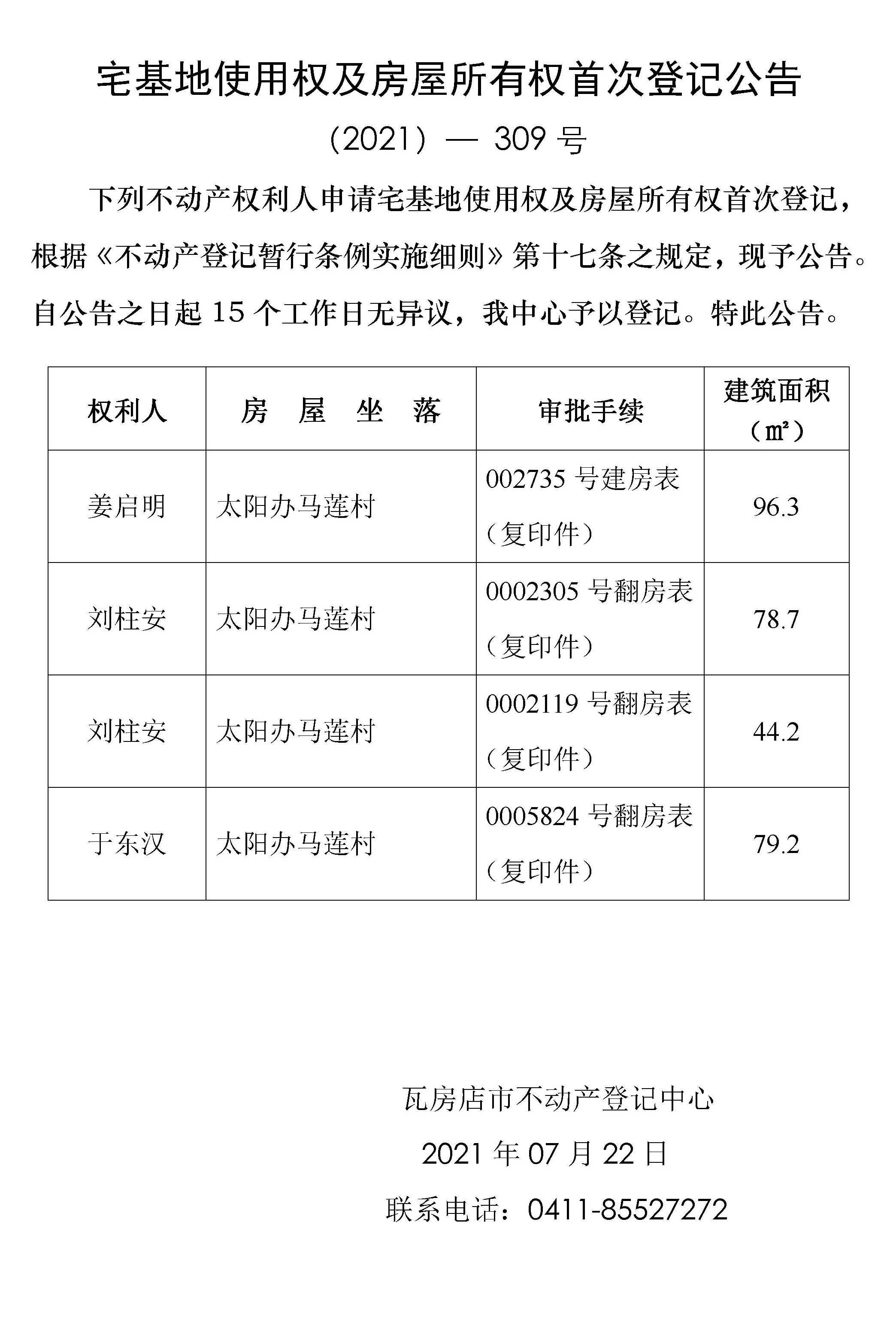 宅基地使用权及房屋所有权首次登记公告 (2021)-309号