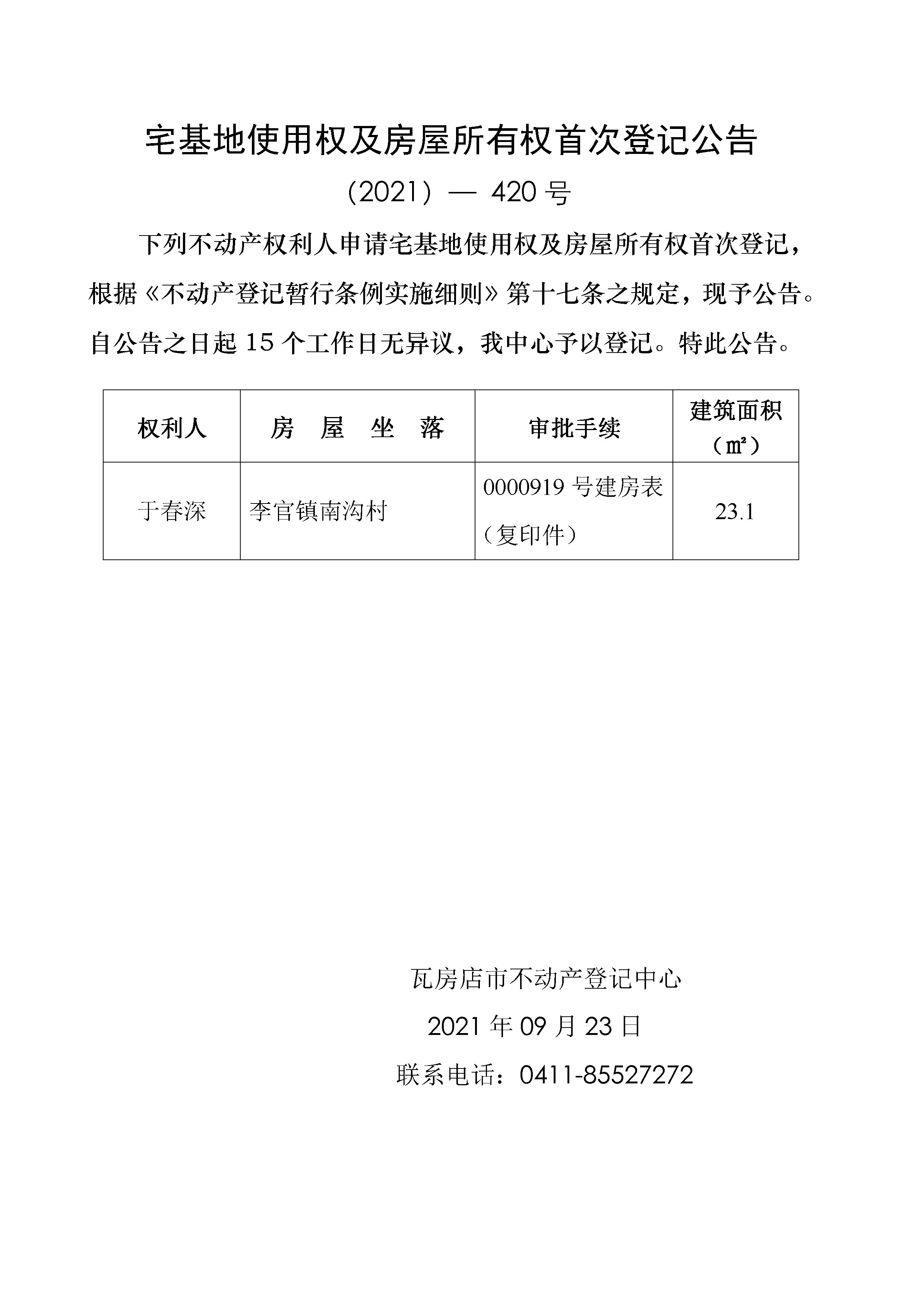 宅基地使用权及房屋所有权首次登记公告 (2021)-420号