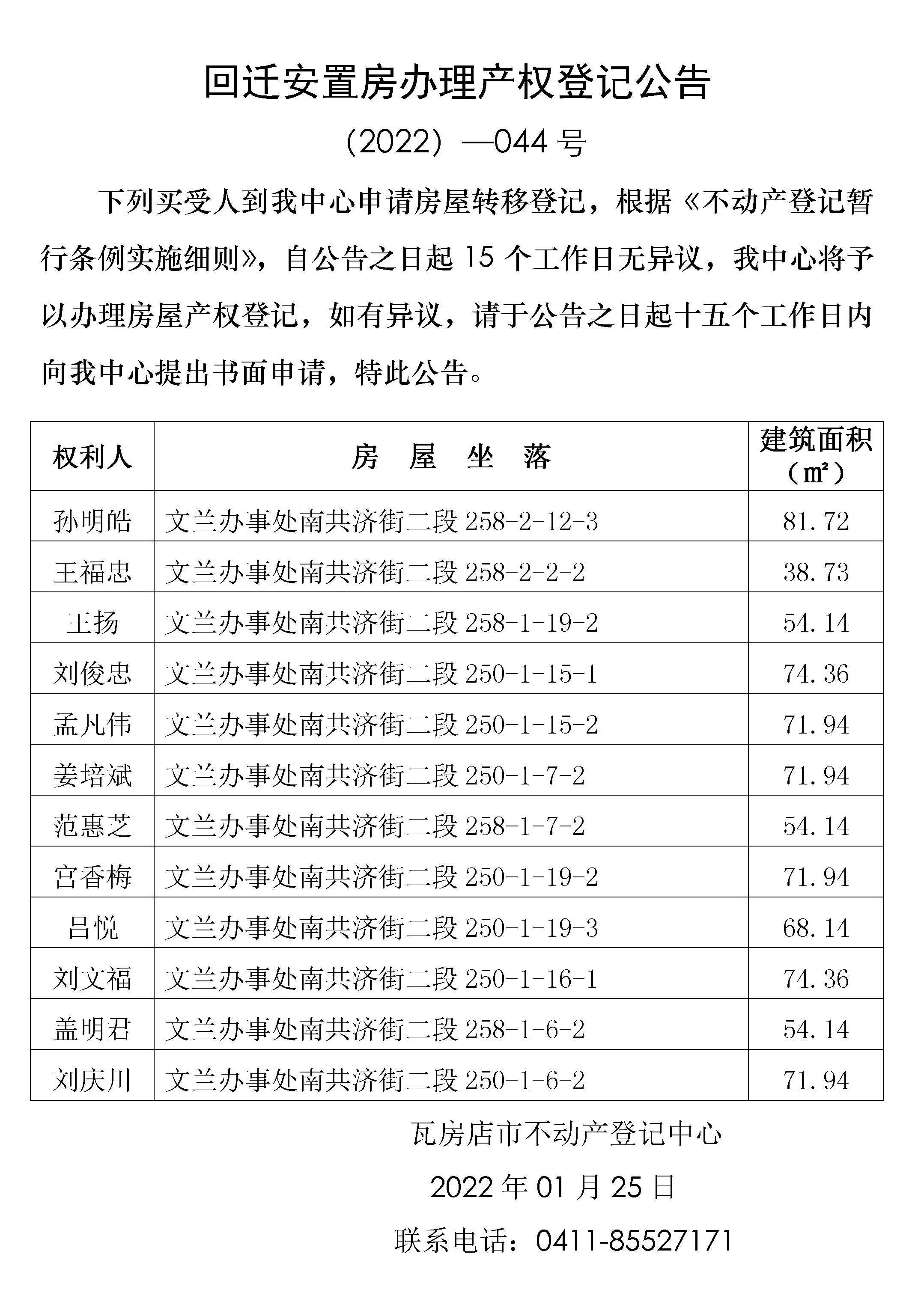 回迁安置房屋办理产权登记公告 (2022)-044号