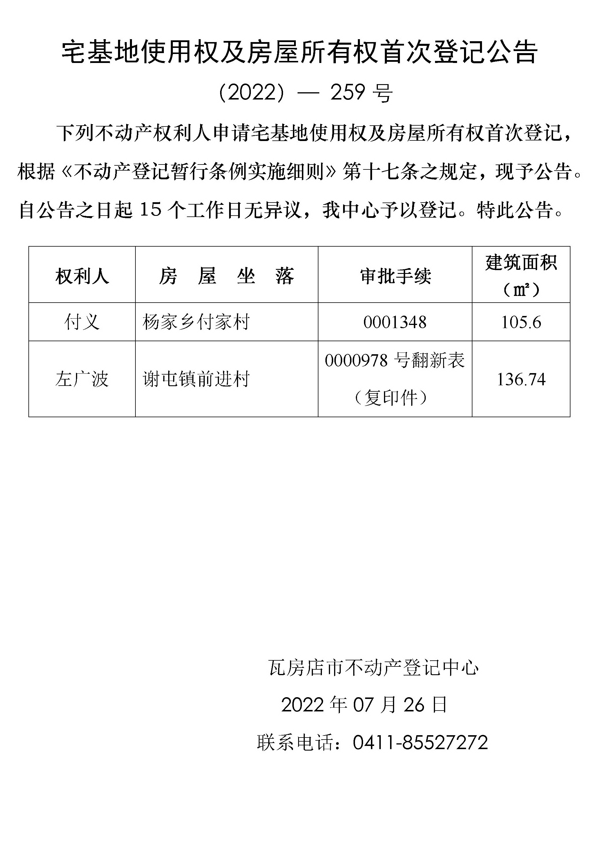 宅基地使用权及房屋所有权首次登记公告 (2022)-259号