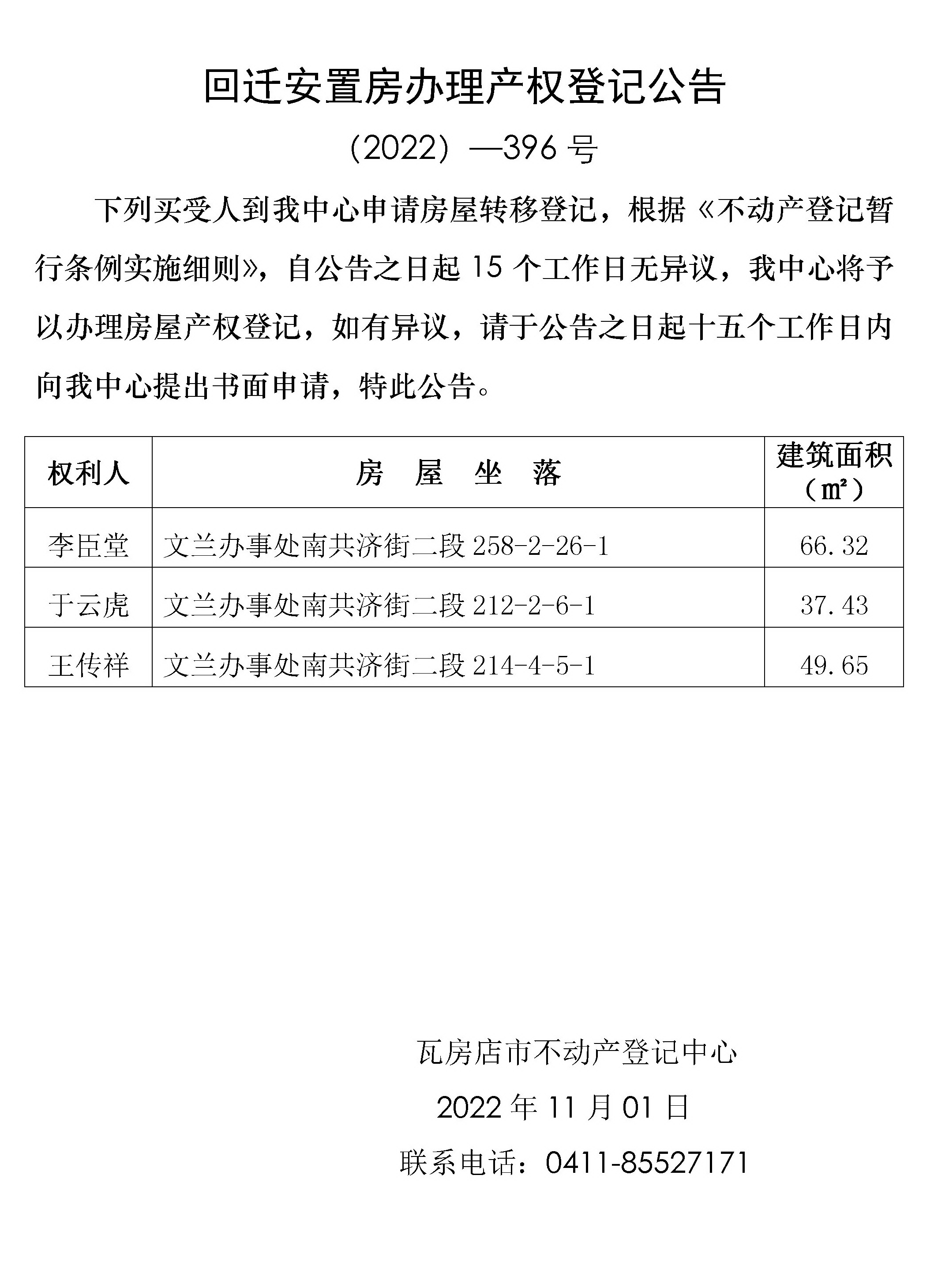 回迁安置房屋办理产权登记公告 (2022)-396号