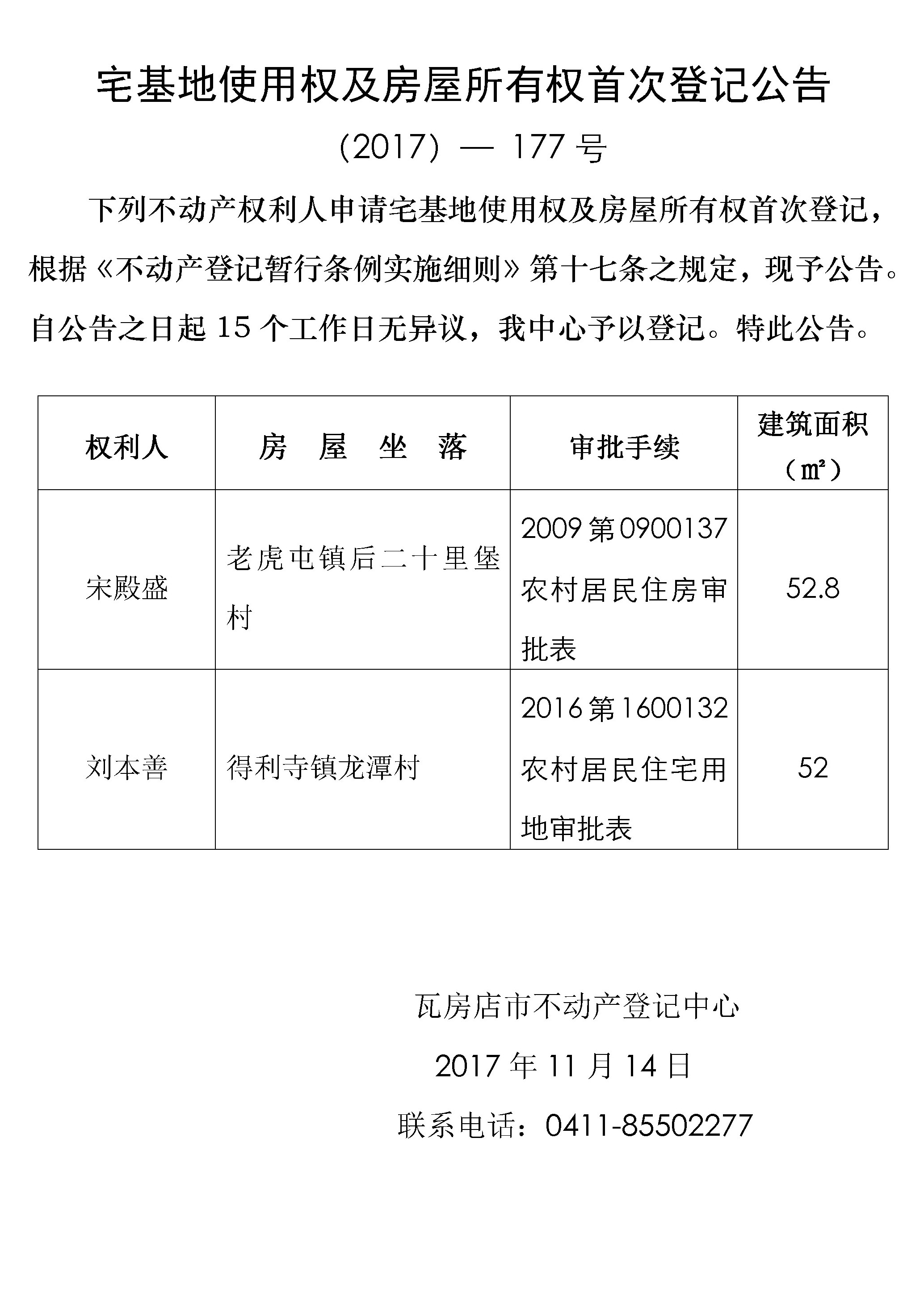 宅基地使用权及房屋所有权首次登记公告 (2017)-177号