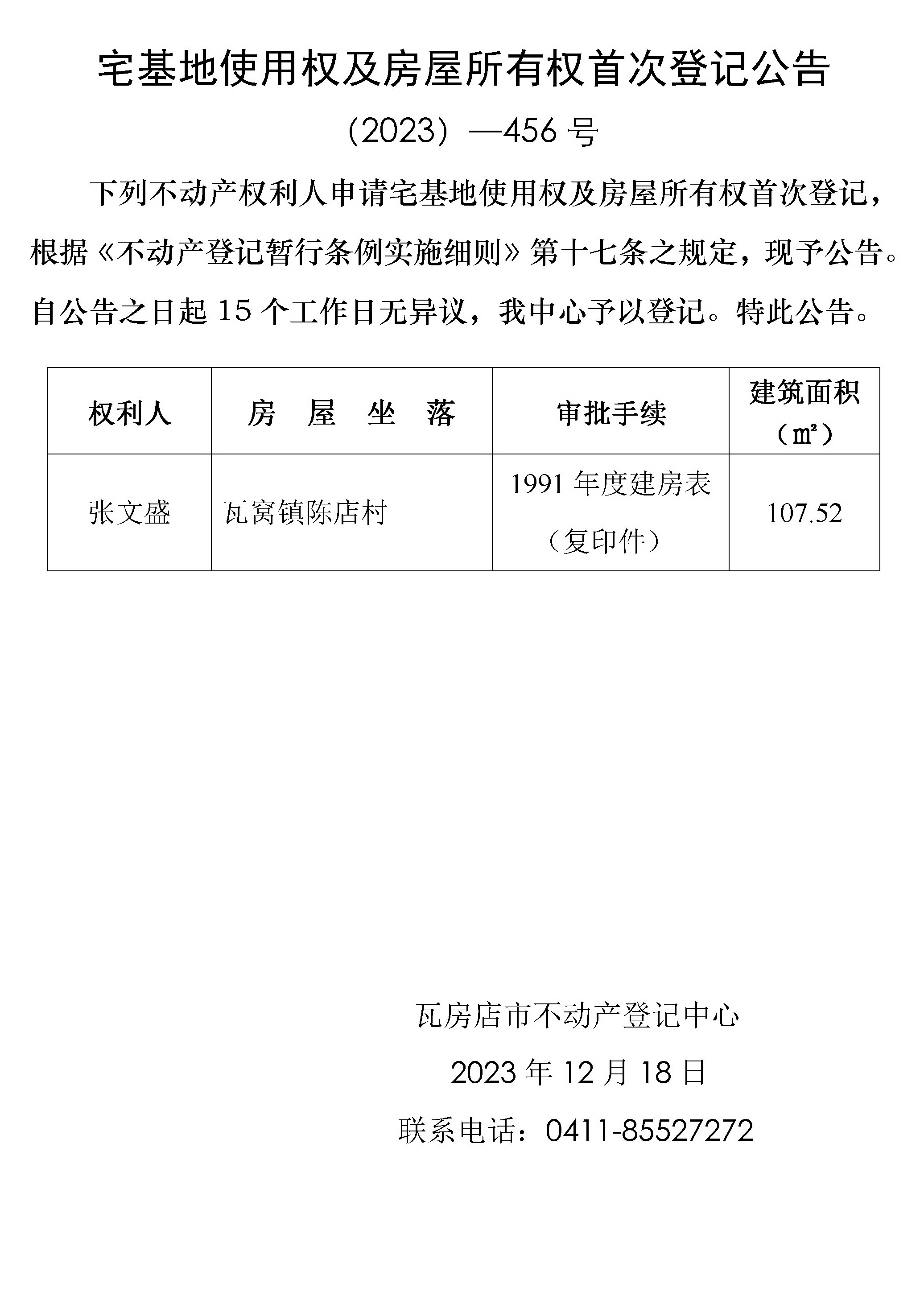 宅基地使用权及房屋所有权首次登记公告 (2023)-456号
