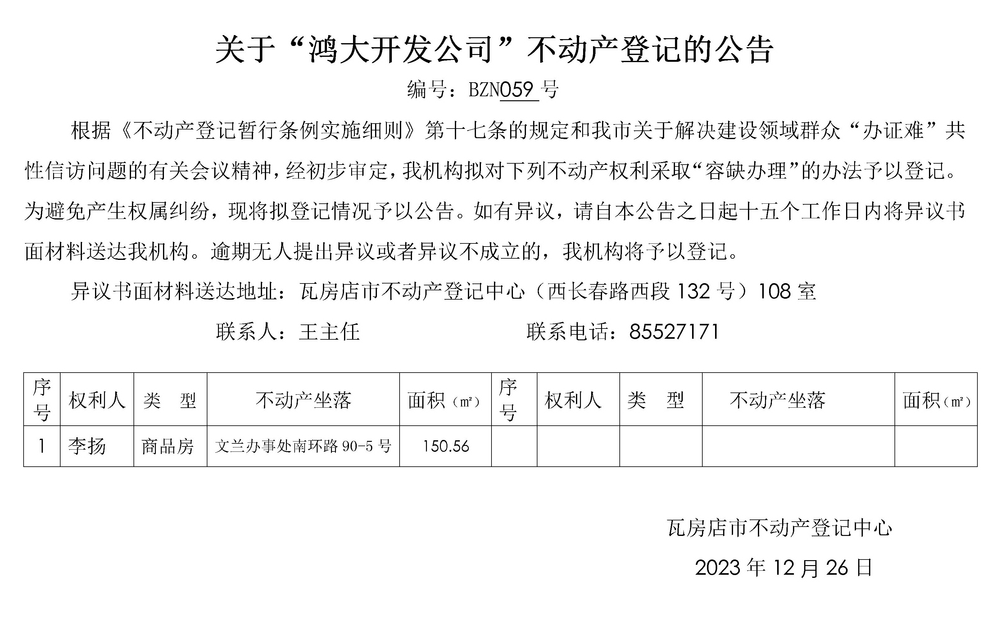 关于”鸿大开发公司”不动产登记的公告-59号