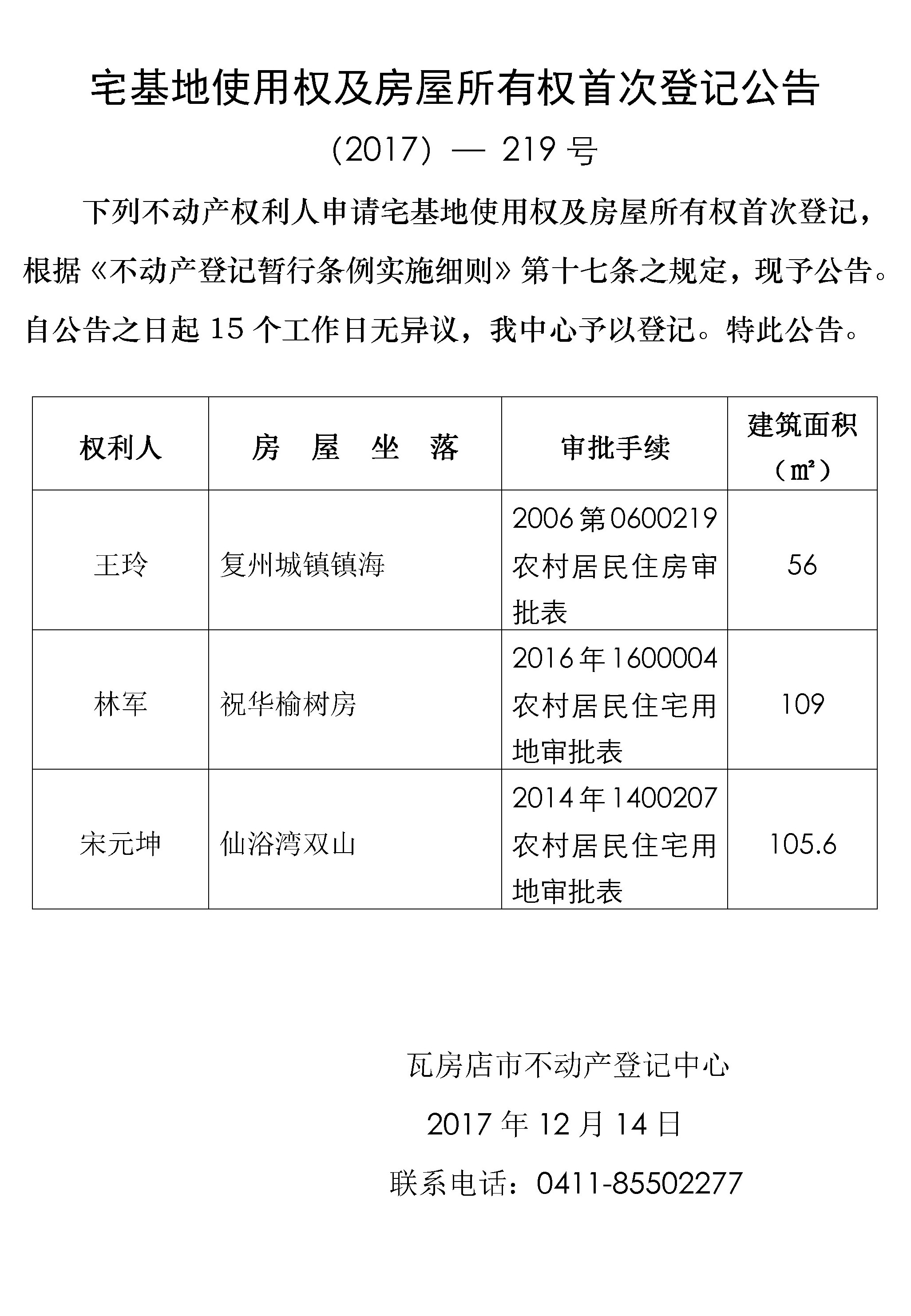 宅基地使用权及房屋所有权首次登记公告 (2017)-219号