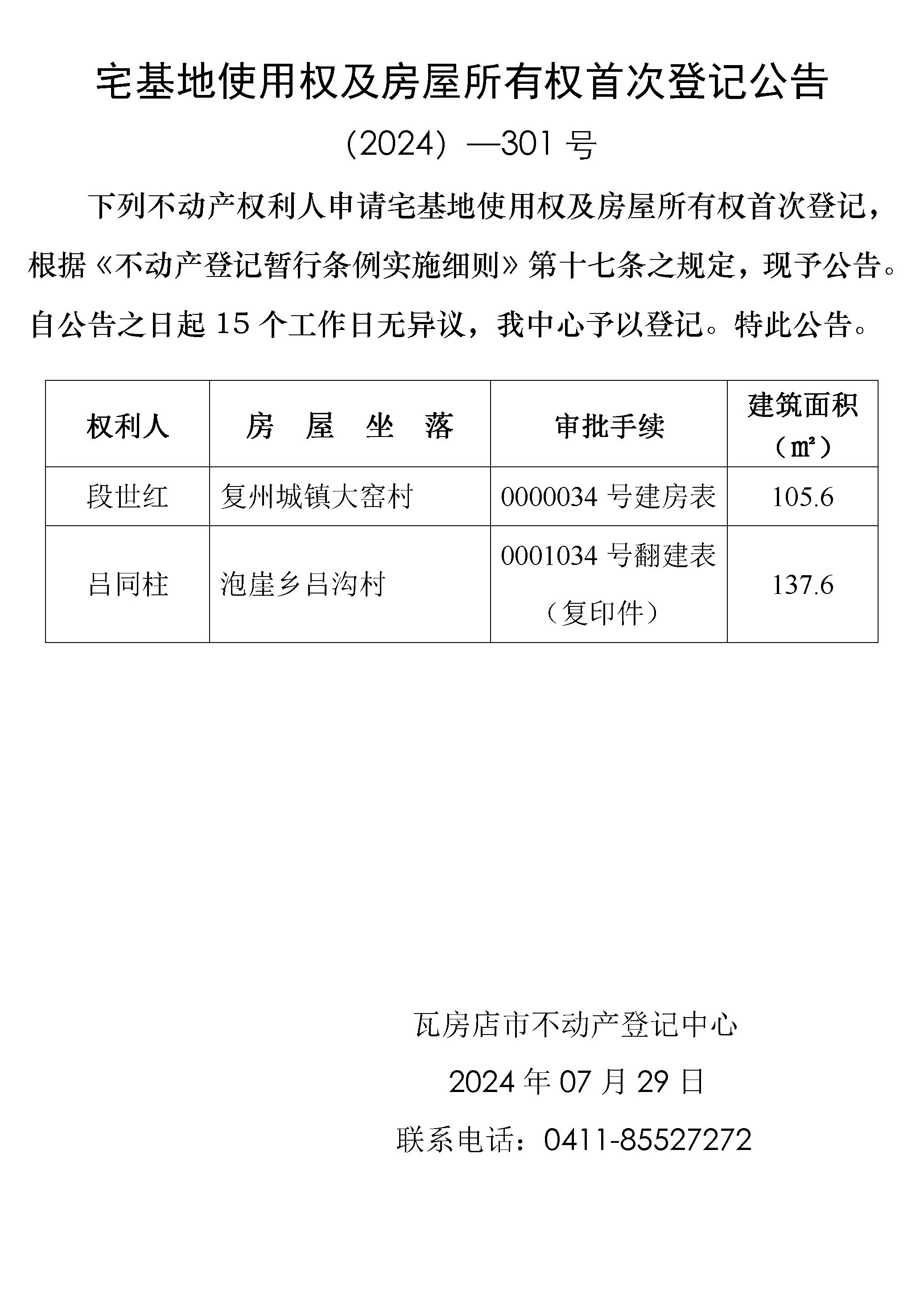 宅基地使用权及房屋所有权首次登记公告 (2024)-301号