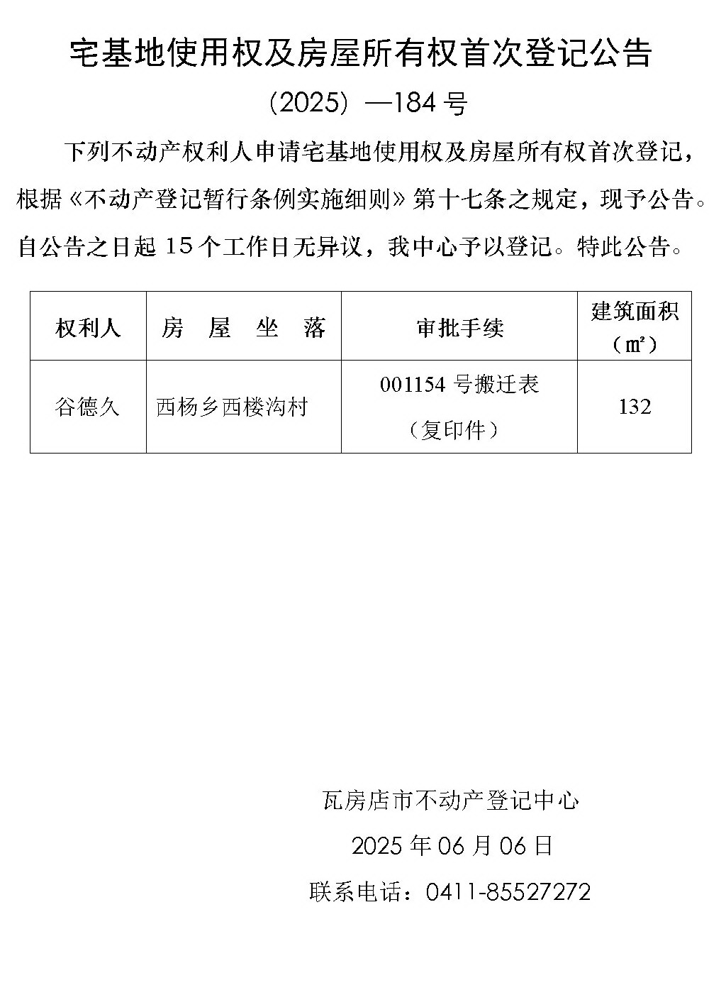 宅基地使用权及房屋所有权首次登记公告 (2025)-184号