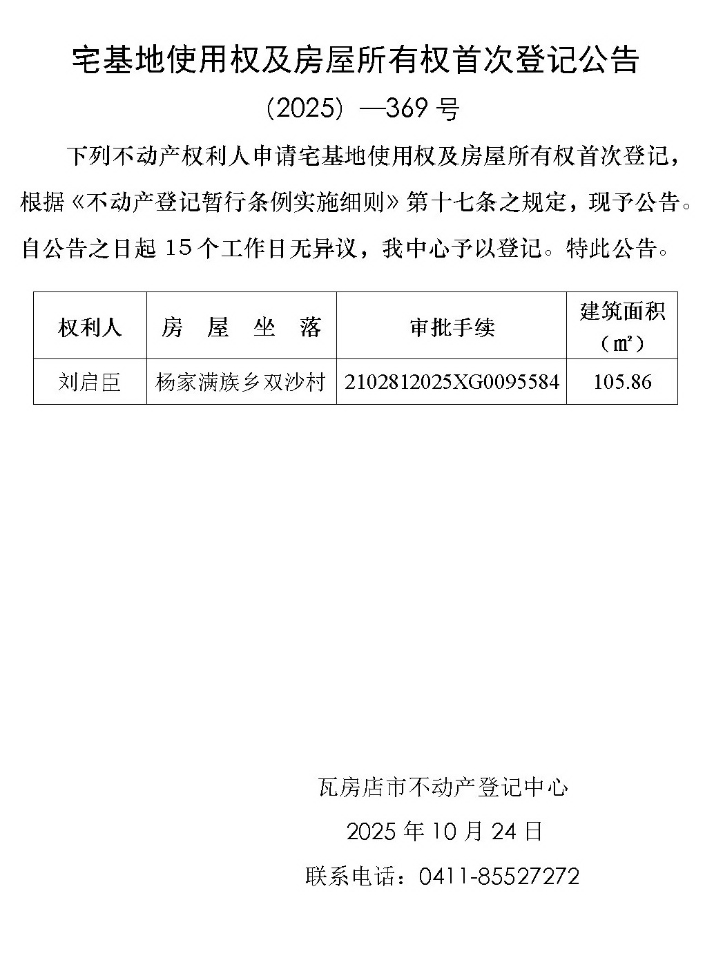 宅基地使用权及房屋所有权首次登记公告 (2025)-369号