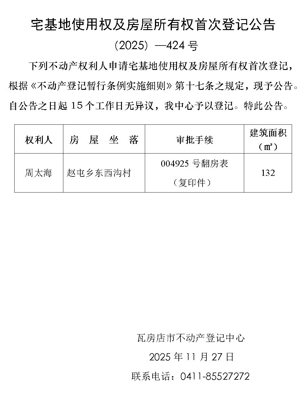 宅基地使用权及房屋所有权首次登记公告 (2025)-424号