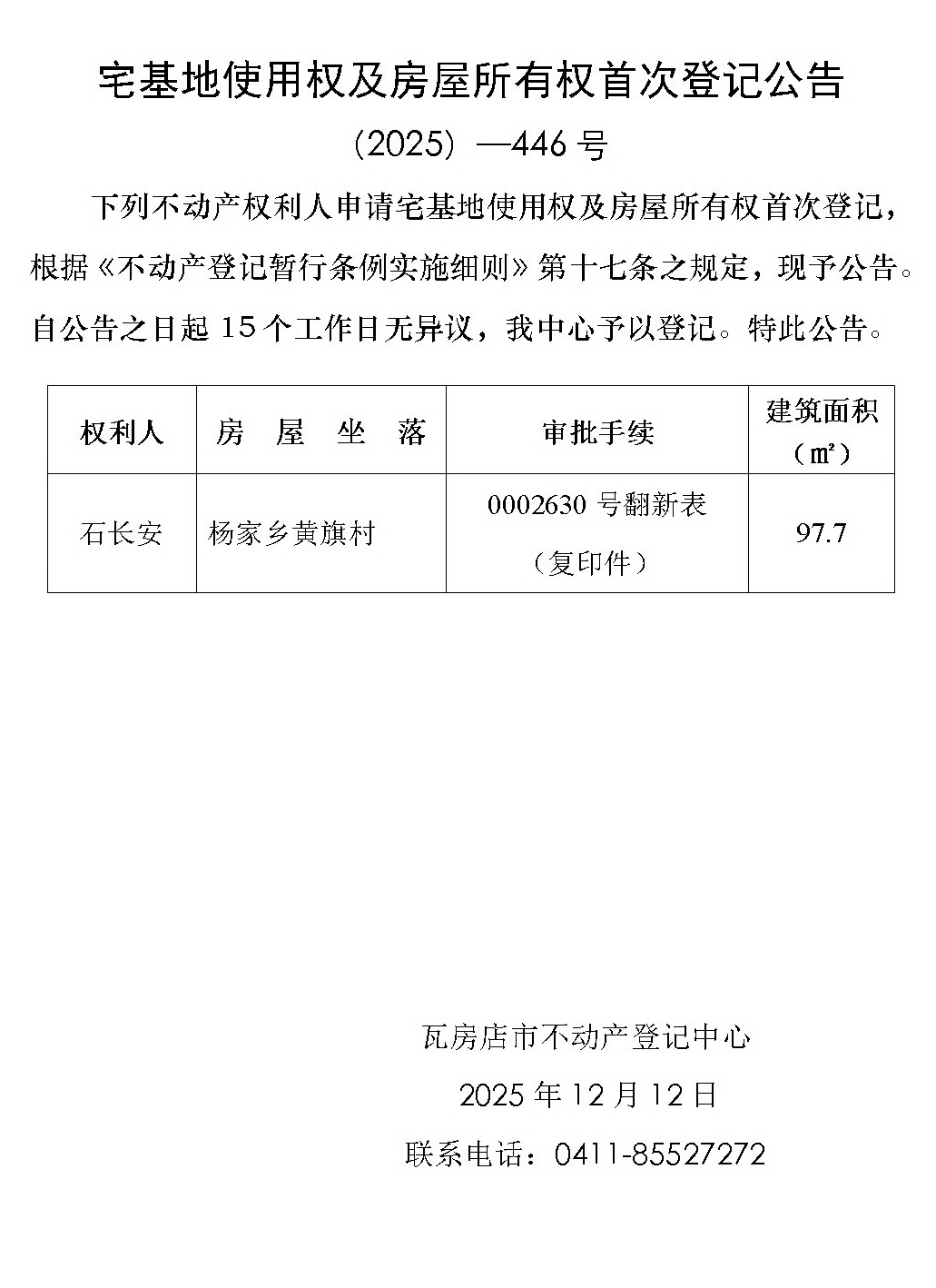 宅基地使用权及房屋所有权首次登记公告 (2025)-446号