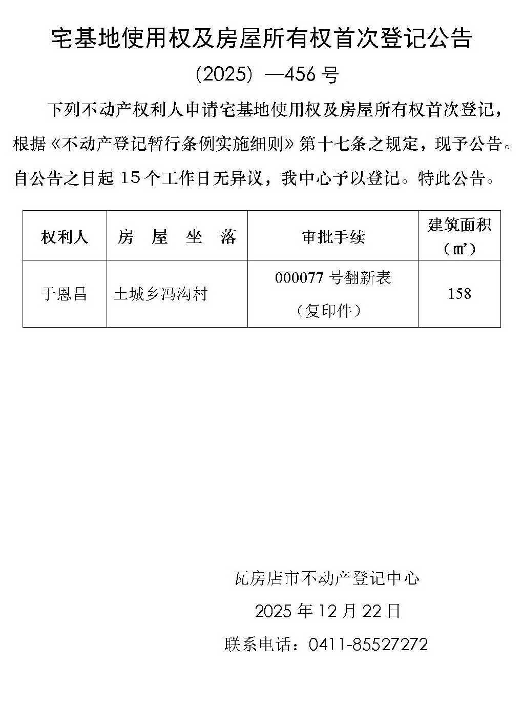 宅基地使用权及房屋所有权首次登记公告 (2025)-456号