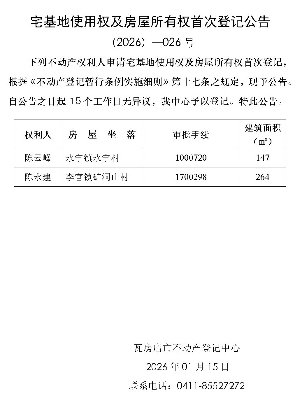 宅基地使用权及房屋所有权首次登记公告 (2026)-026号