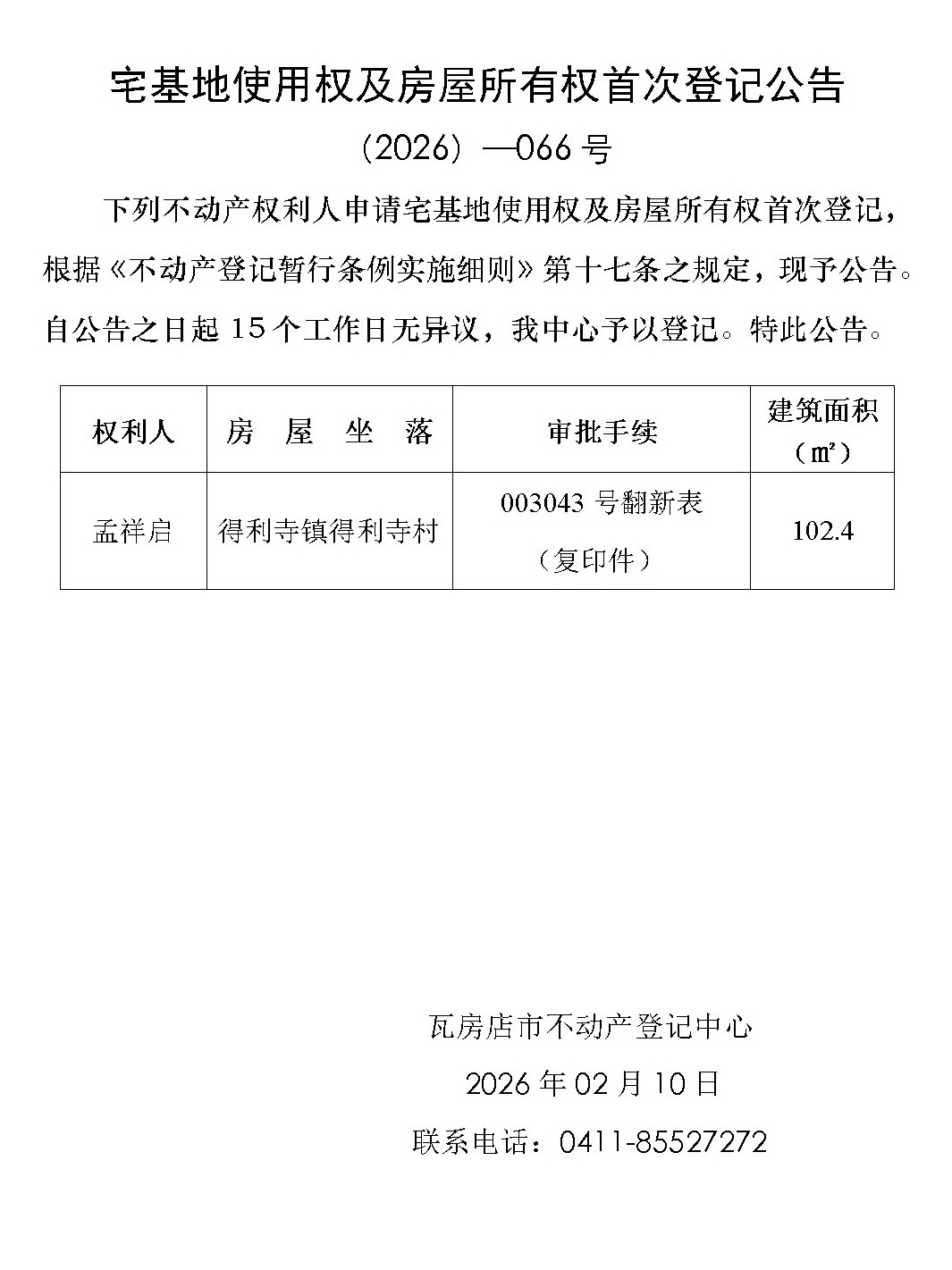 宅基地使用权及房屋所有权首次登记公告 (2026)-066号