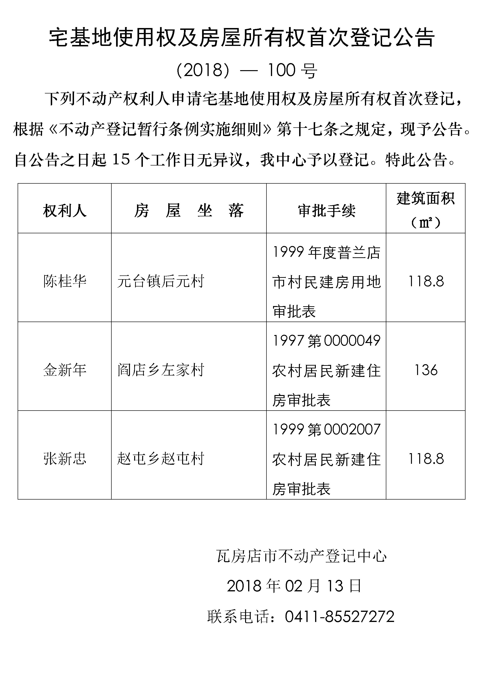 宅基地使用权及房屋所有权首次登记公告 (2018)-100号