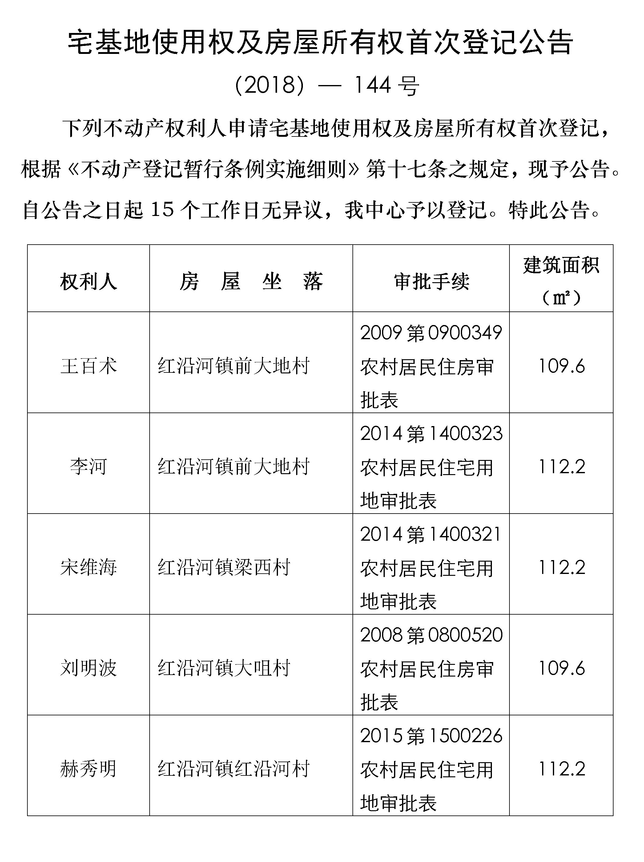 宅基地使用权及房屋所有权首次登记公告 (2018)-144号