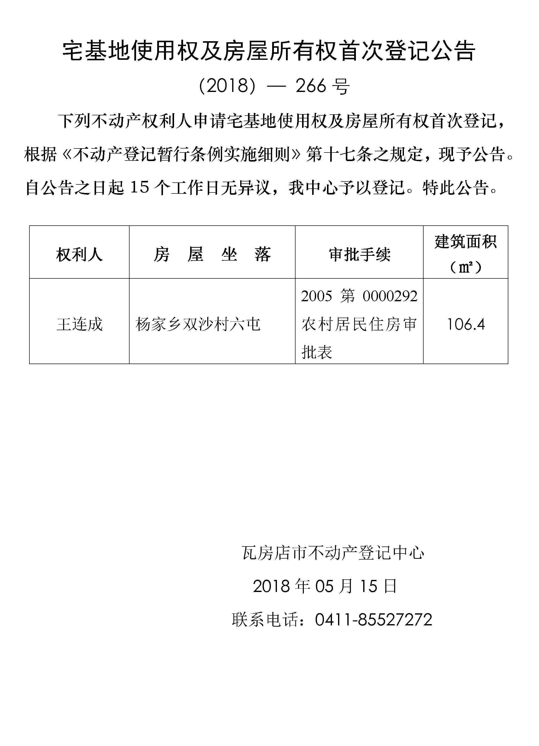 宅基地使用权及房屋所有权首次登记公告 (2018)-266号